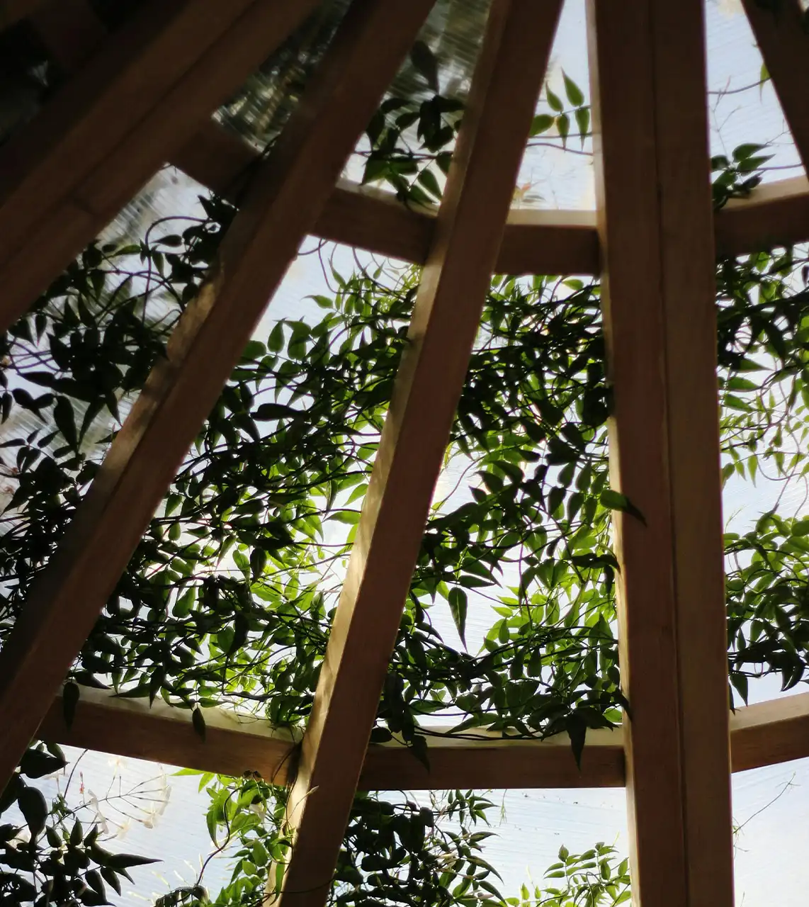 Honeysuckle, mint, and violet leaf transport you to a lush oasis cocooned by glass and light, where verdant greens and heady blooms dance in its dappled glow.
